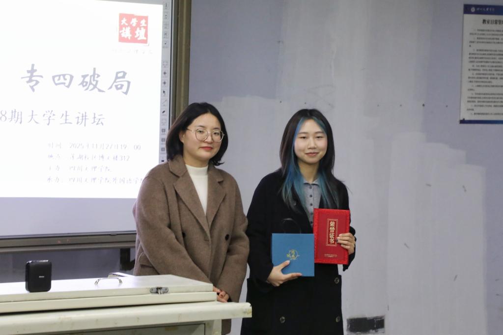 讲坛尾声,叶柳老师为黄婧奕同学颁发荣誉证书,以表彰她乐于分享、倾囊相授的责任担当。随后,叶柳老师对本次讲坛核心内容进行精炼总结,既梳理了实战备考技巧与成长经验的核心精髓,也鼓励同学们主动向优秀学长学姐及身边师长请教,在提问交流与探索实践中积累成长,稳步迈向专四备考的新阶段。