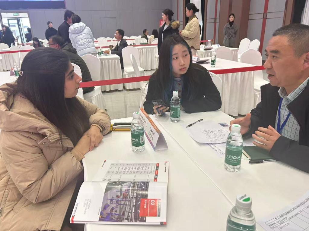 与此同时,在达州工人文化宫进出口商品洽谈会现场,2023级员工则穿梭于各展区与洽谈桌之间,为中外企业提供即时、精准的口译服务。他们以专业的语言功底搭建起供需双方的沟通桥梁,有效破除语言壁垒,助力企业深入开展商贸洽谈与合作对接,切实提升了洽谈实效。领队教师许蔚翰全程跟进指导,通过实时反馈、专业点拨与现场示范,帮助员工及时优化服务细节,确保翻译工作的专业水准与服务品质,为校地合作实践筑牢专业支撑。
